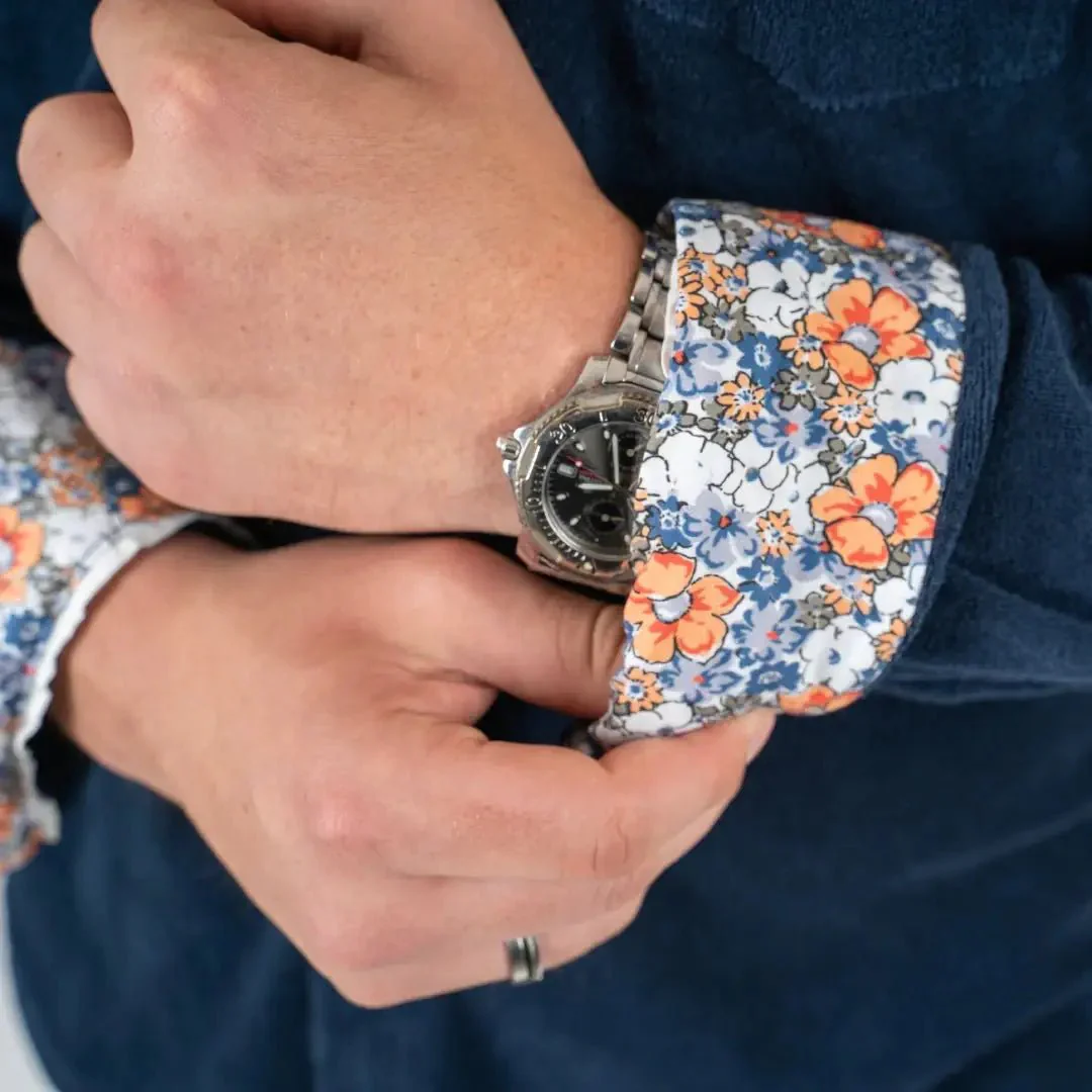 - Détails fleuris contrastés à l’intérieur du col et des poignets