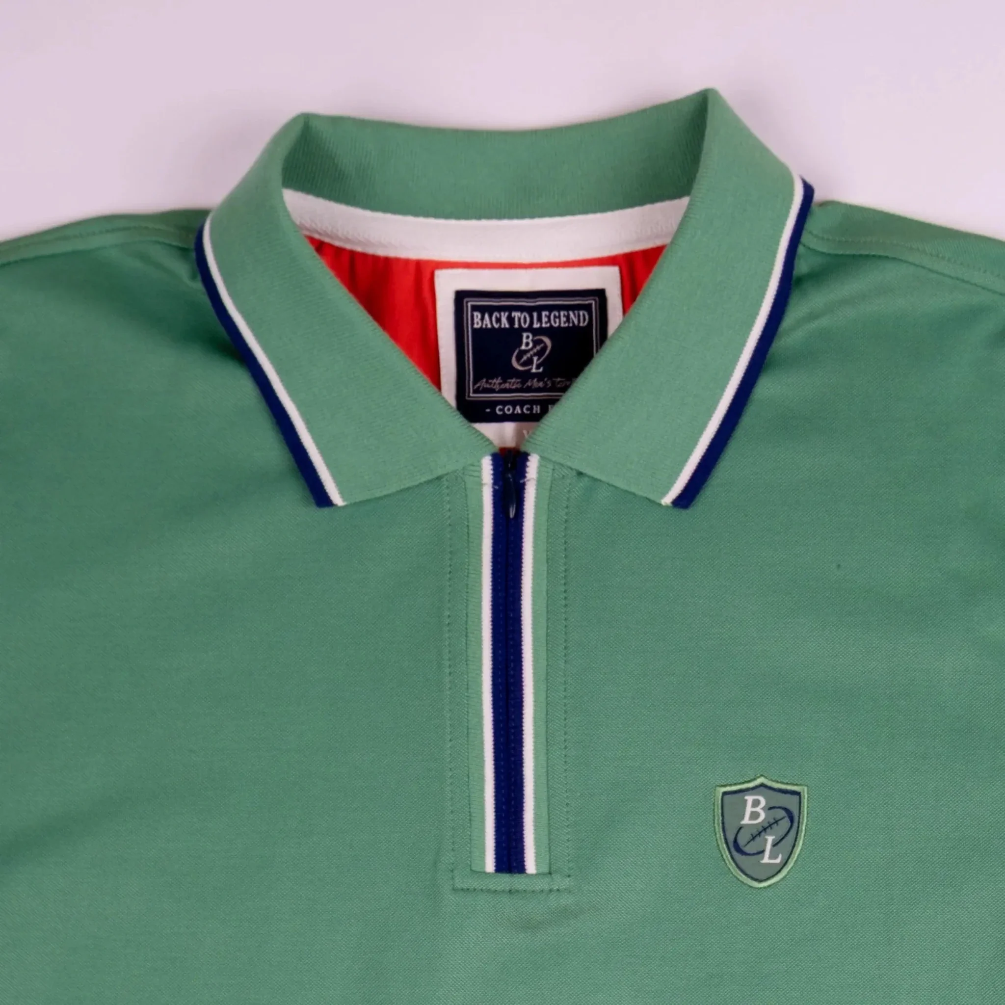 Le col en bord côte ton sur ton est souligné de rayures contrastées bleu marine et blanc, apportant du relief à l’ensemble. La patte de boutonnage zippée, elle aussi rayée, affirme le caractère technique du modèle. On retrouve cette finition en bord côte également au bas des manches pour un maintien optimal. Sur la poitrine, le badge brodé "BL" cerclé d’un ballon de rugby incarne l’ADN de la marque BACK TO LEGEND. Des fentes latérales discrètes viennent parfaire le confort au porter. Un essentiel revisité, parfait pour ceux qui veulent afficher un style casual sport chic sans compromis.